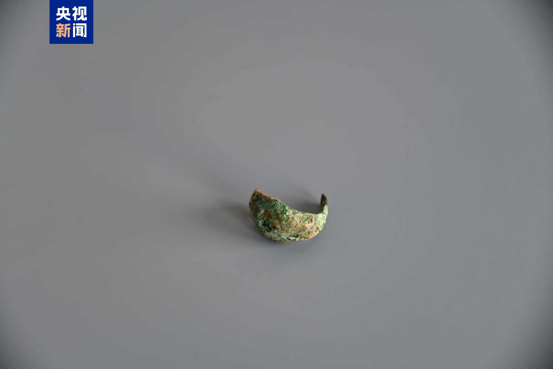 铜戒指保存较差,锈蚀较严重,圈底一侧已经残损,戒面较宽、有1.2厘米,径长约1.7厘米。