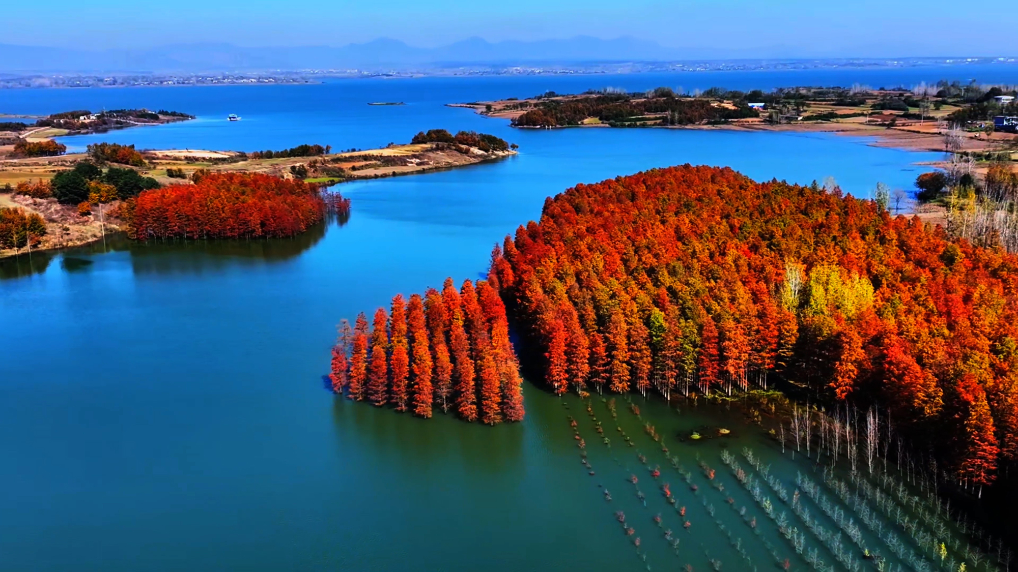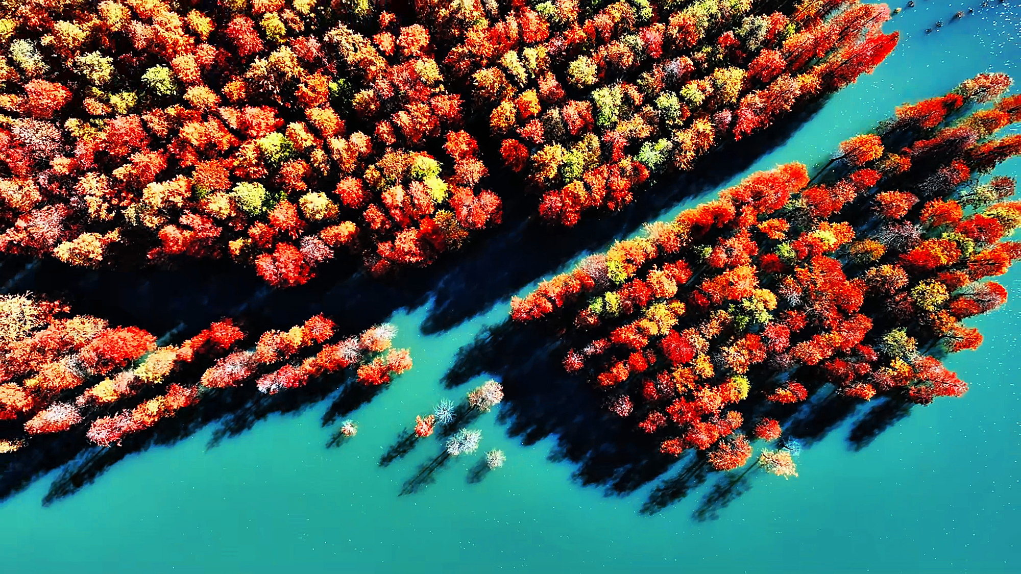 航拍镜头下的板桥水库呈现出一幅色彩浓郁、如梦似幻的美丽画卷。