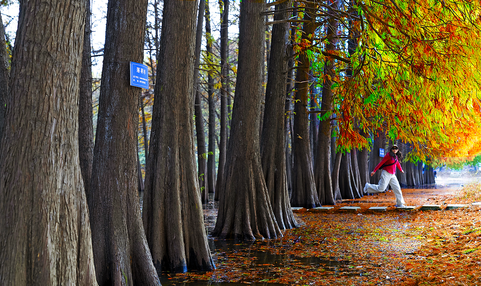 不少市民趁着晴好天气,来到公园赏景拍照,定格这份初冬限定美景。