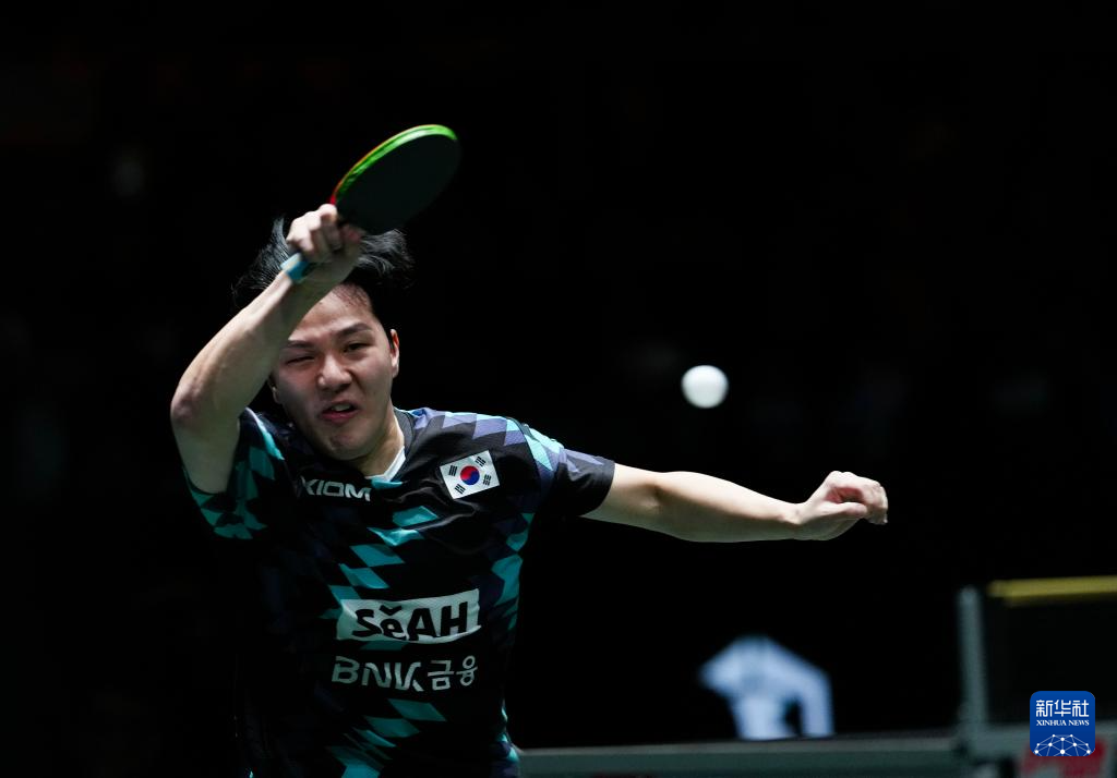 12月4日,韩国队选手安宰贤在男单比赛中回球。他以0比2不敌中国队选手王楚钦。