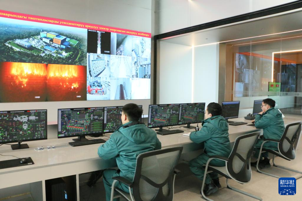 12月27日,在吉尔吉斯斯坦比什凯克,工作人员在比什凯克市垃圾焚烧发电项目中央控制室监测项目运行情况。