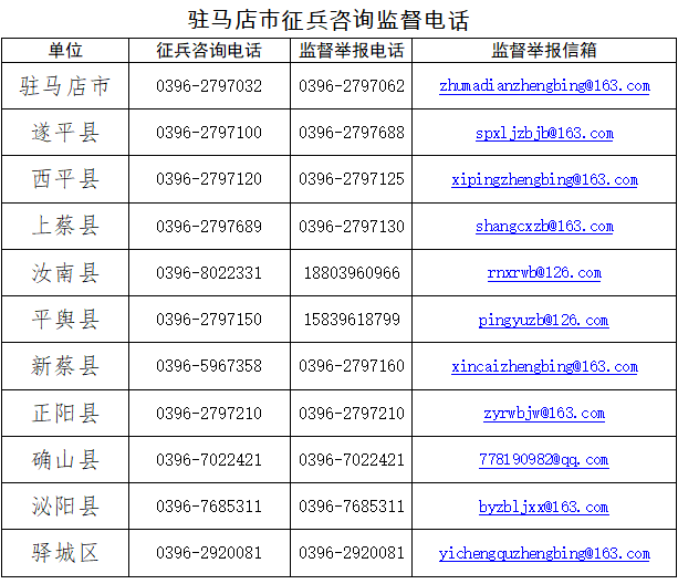 驿城区人民政府征兵办公室:0396-2920081