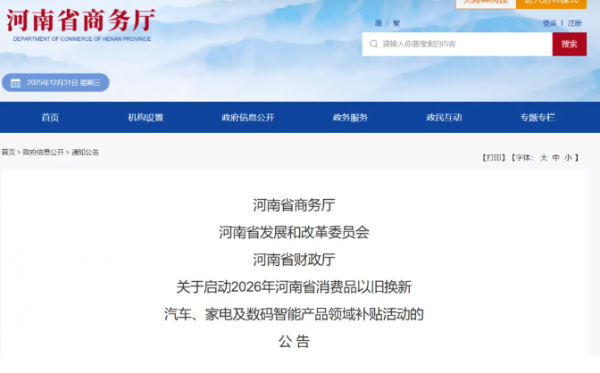 12月31日,我省就2026年河南省消费品以旧换新汽车、家电及数码智能产品领域补贴发出公告。全文如下: