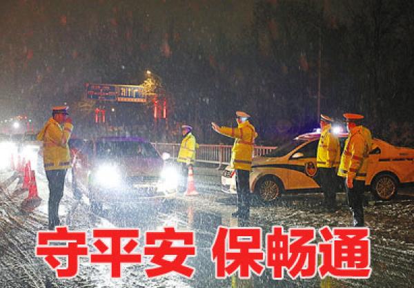 近日,上蔡县公安局交通管理大队与巡特警大队全员在岗在位、顶风冒雪奔赴城区主干道、高速出入口等车流密集路段,疏导车流、指引车辆平稳通行,保障群众出行平安。(通讯员 班闯)