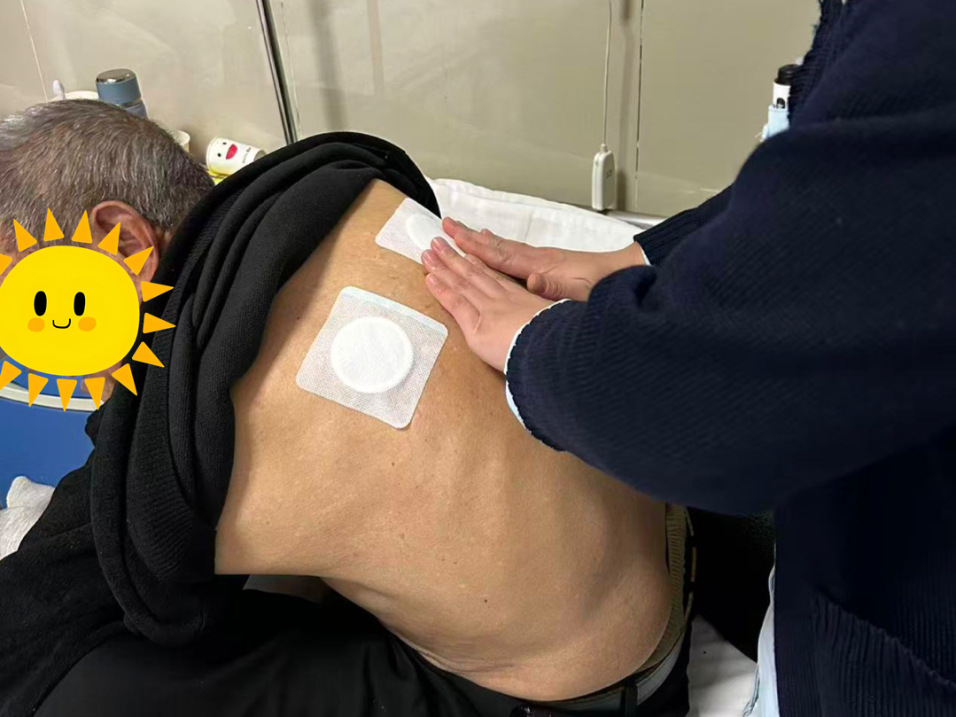 李先生入院后,医生除了给予西药治疗以外,针对他的情况,呼吸与危重症医学科团队同时为他推荐了中药贴敷。这种治疗减少了抗生素的使用,降低了药物的副作用对身体的影响,同时也避免了喝中药的麻烦,将特制的中药药膏贴敷于身体特定的穴位上,通过皮肤吸收和经络传导,使药物直达病灶,起到驱散风寒、宣通肺气、止咳化痰的作用。