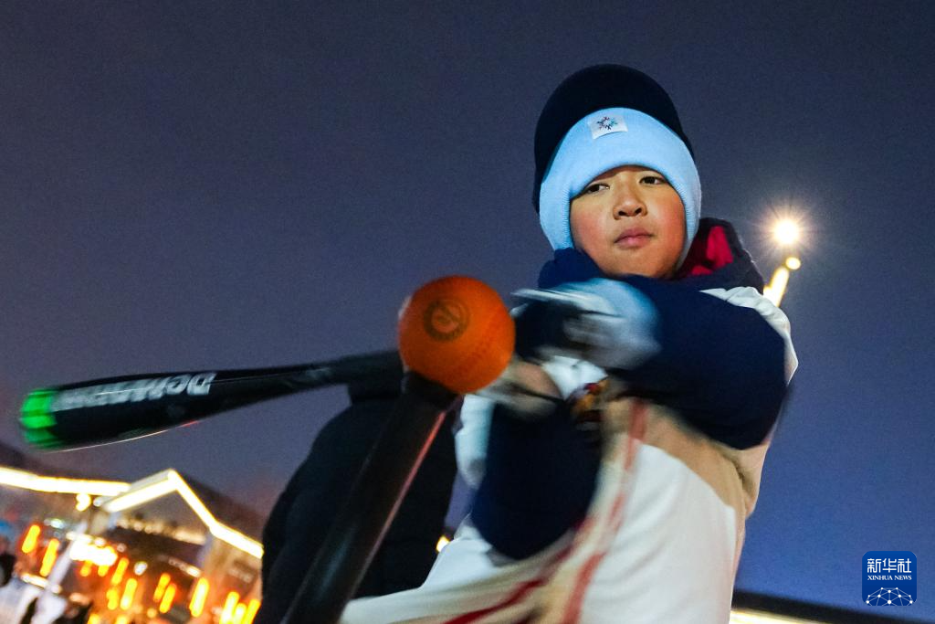 1月6日,一名小朋友在活动现场进行雪地棒垒球展演。