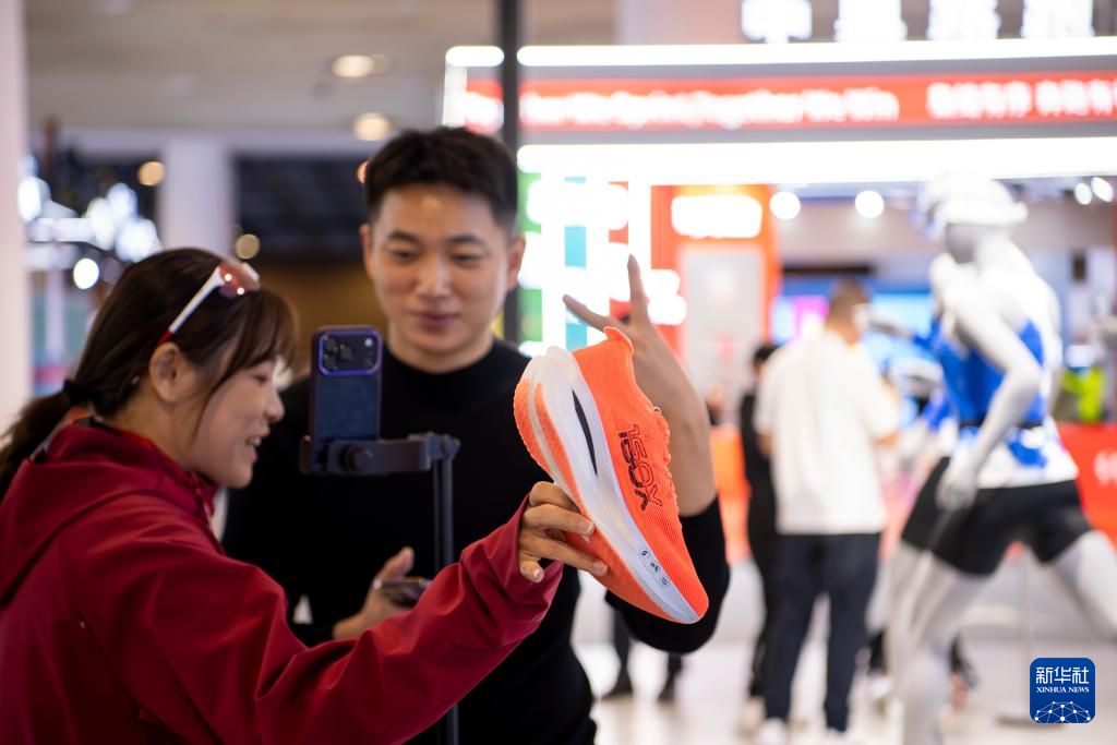 1月8日,两名体育用品企业工作人员在博览会现场利用电商平台直播推销运动鞋。