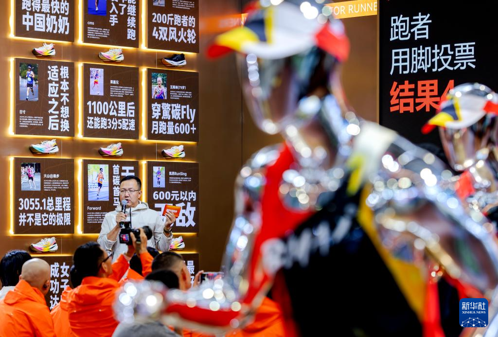 1月8日,一家体育用品厂商在博览会上推介自己的马拉松赛事体育用品。