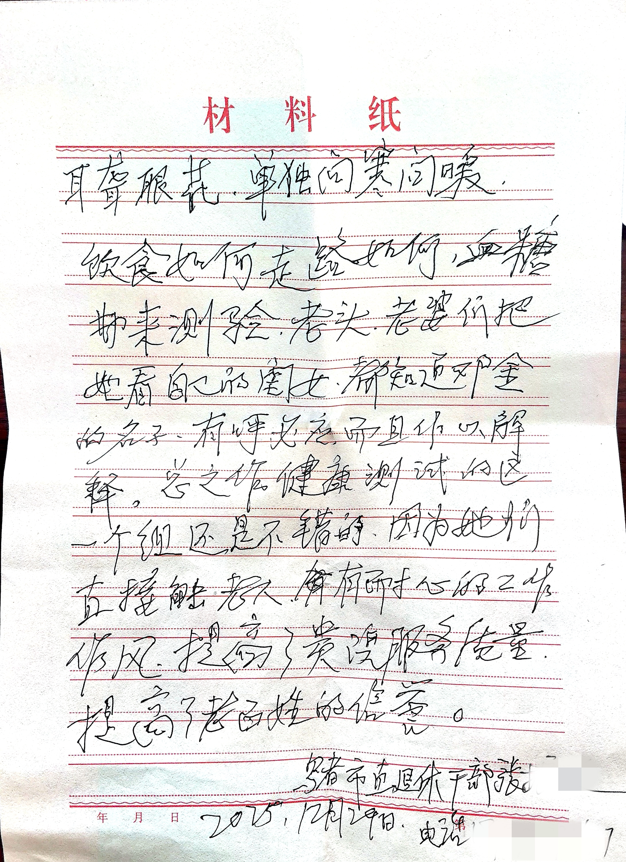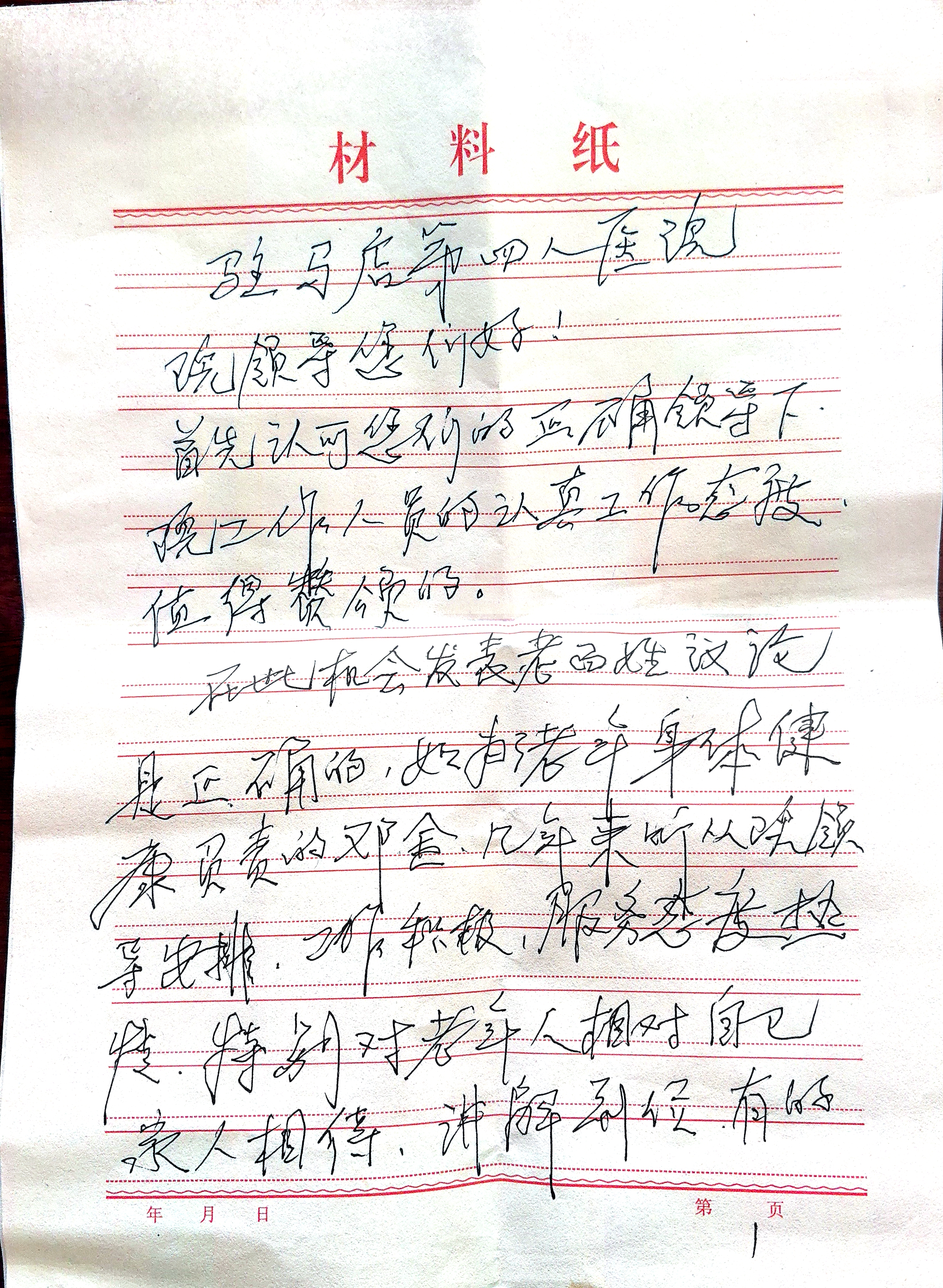 多年来,张先生对工作人员非常信任与认可,于是便手写了一封感谢信,赞扬驻马店市第四人民医院领导有方、雪松社区卫生服务中心的工作人员态度好,对老人像家人一样照顾有加。