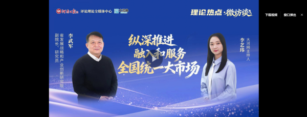 编者按:形成强大国内市场是构建新发展格局的重要支撑,也是大国经济优势所在。省委经济工作会议把“要充分用好优势,纵深推进融入和服务全国统一大市场”放在首要位置。2025年河南出台相关实施方案,建立150项年度任务清单,开展10项重点事项攻坚,着力破卡点、强联通、建枢纽、增动力、提能级。今年将出台新的重点任务清单,推出新一轮10个集中攻坚事项,上线融入服务全国统一大市场数据平台。《理论热点·微访谈》邀请到省发展战略和产业创新研究院副院长、研究员李武军,请他谈谈对这个话题的认识和理解——