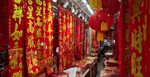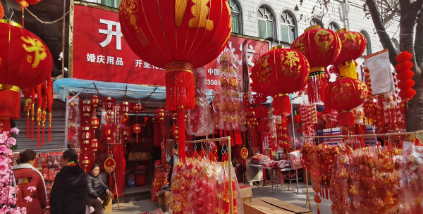 当天上午,记者来到市交通路东段采访。远远便看到,几家经营婚庆用品的门店外挂满了红彤彤的马年饰品和新春对联。走进店内,更是仿佛置身红色的海洋——烫金春联、刺绣挂件、各式灯彩、年画等琳琅满目,其中骏马主题的新年饰品尤为抢眼。
