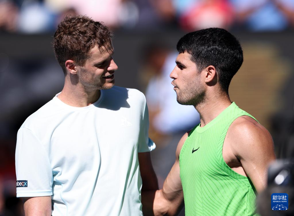 1月21日,西班牙选手阿尔卡拉斯(右)与德国选手汉夫曼在赛后致意。