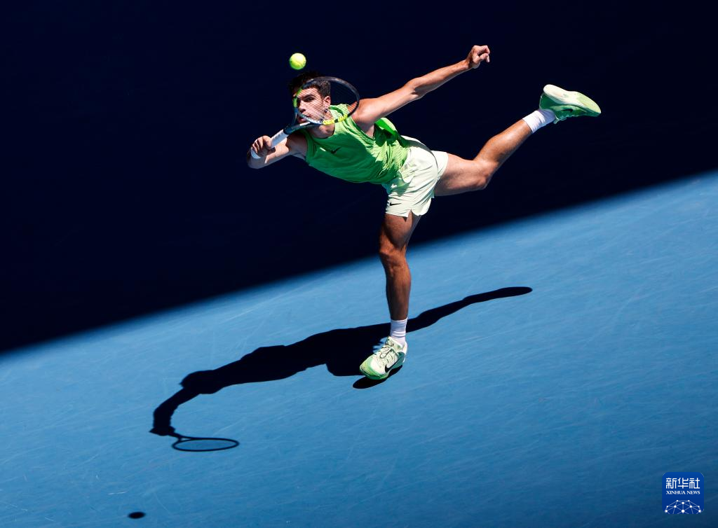1月21日,西班牙选手阿尔卡拉斯在比赛中发球。