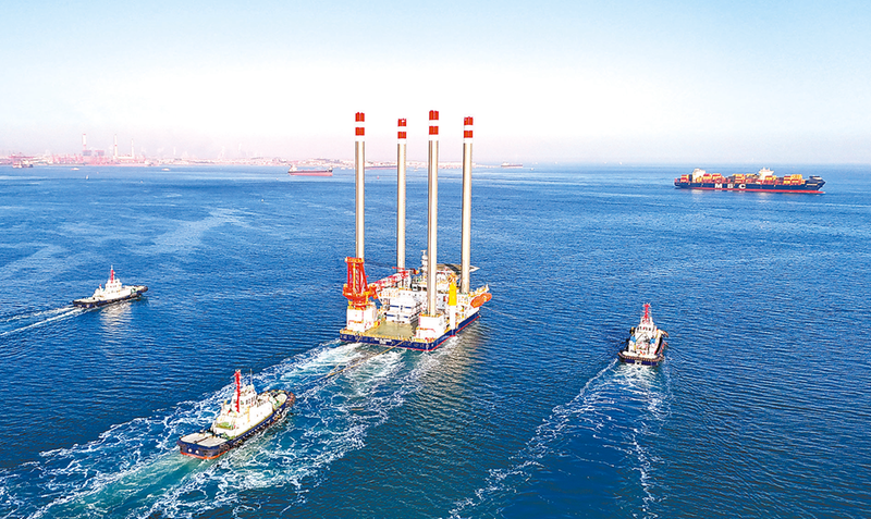 1月22日,由中船武汉船机海西重机自主设计建造的新一代自升式海上作业支持平台从青岛西海岸新区离泊赴中东(无人机照片)。