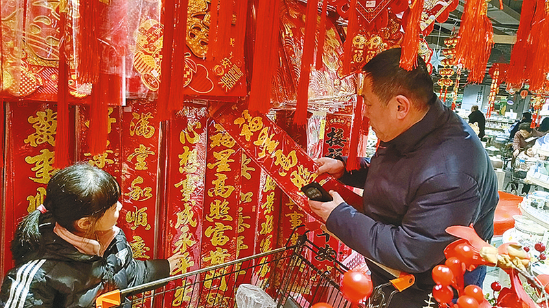 市区早已成了红色海洋,各式春联整齐悬挂,“龙马精神启新程”“骏业宏图添锦绣”等马年春联熠熠生辉。市民驻足挑选、细细品读,讨价还价的声音伴着欢声笑语,在街巷里此起彼伏。
