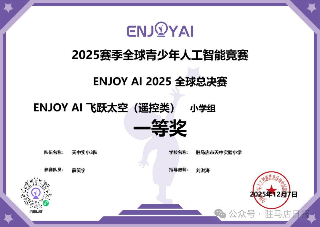 近日,ENJOY AI 2025全球总决赛暨第三届乌镇国际教育机器人节在浙江乌镇圆满落幕。驻马店经济开发区天中实验小学学子在全球61个国家和地区6万余名选手的激烈角逐中脱颖而出,徐誉洋、薛笑宇同学勇夺“飞跃太空(遥控类)”小学组一等奖,王也尘同学斩获三等奖。