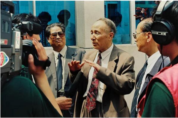 新华社记者穆青(中)、冯健(右二)和周原(右四)在兰考县接受记者采访(摄于1994年5月)。新华社记者 王颂 摄