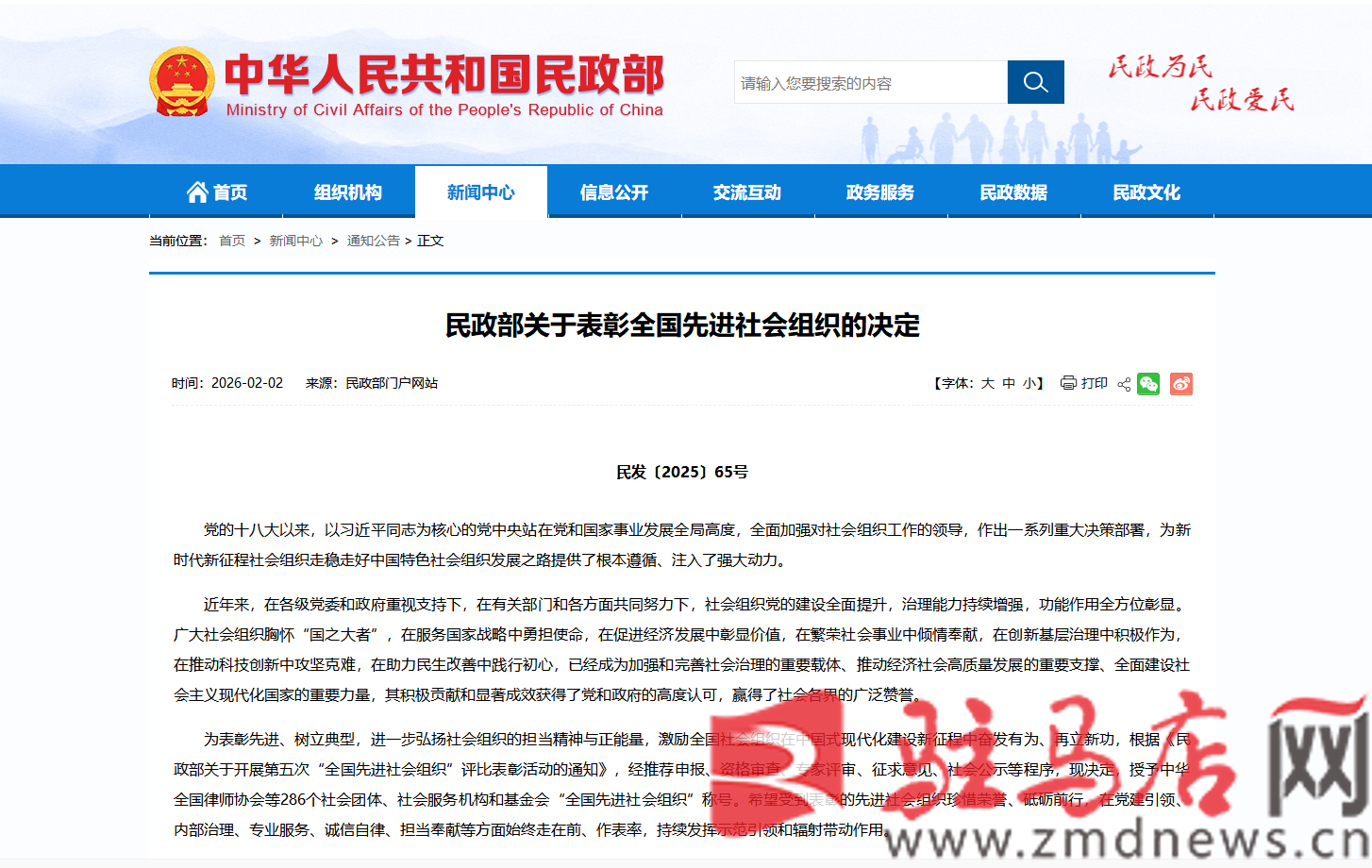 驻马店网讯(记者 张乾阳)2月2日,民政部发布《关于表彰全国先进社会组织的决定》,授予全国286个社会团体、社会服务机构和基金会“全国先进社会组织”称号。中国建筑材料流通协会位列其中。