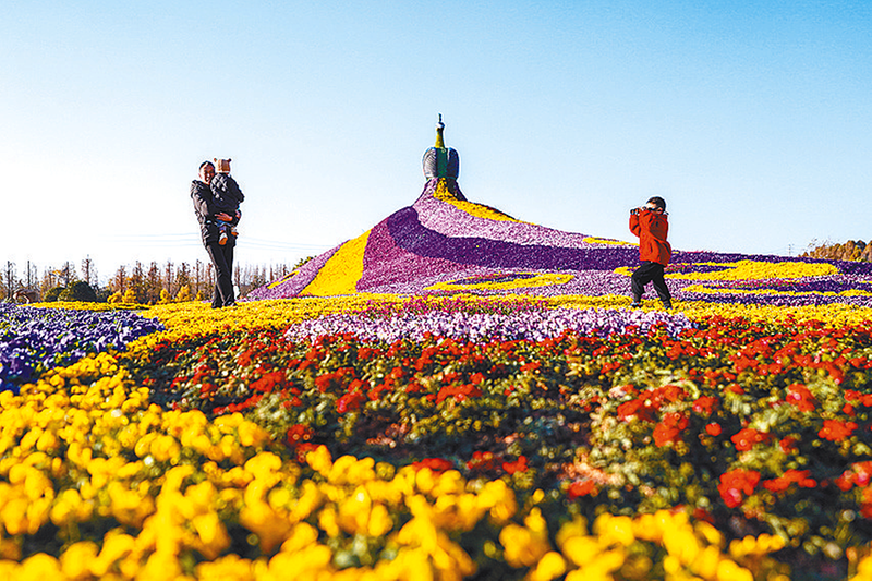 2月10日,市民、游客在昆明市呈贡区的七彩花海公园游玩。