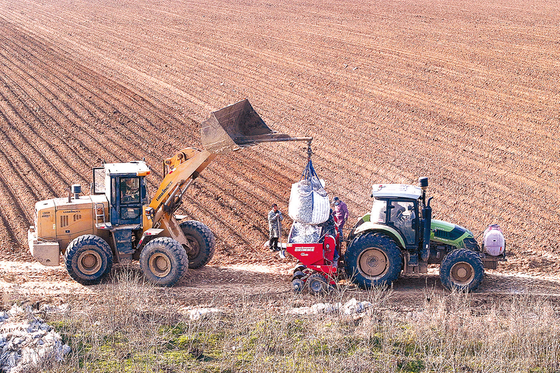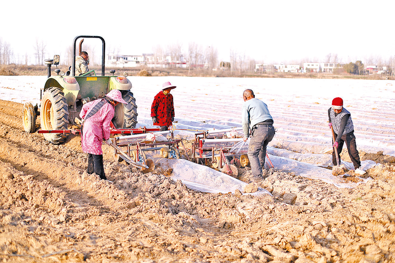 2月12日,正阳县大林镇十门村田间一派繁忙景象,农户抢抓农时,采用机械化播种、覆膜技术种植土豆320亩,高效推进春耕生产。