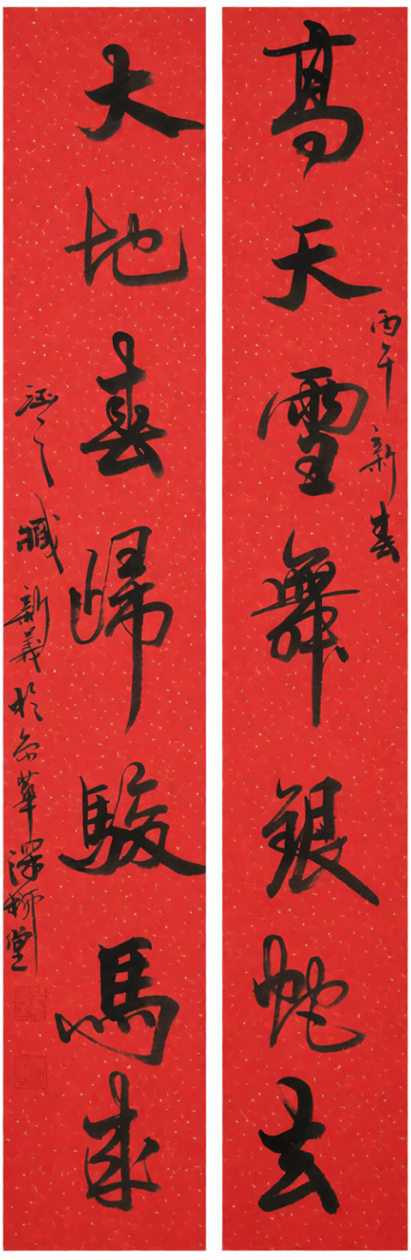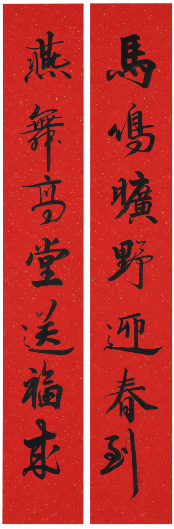 风雪送冬去,马蹄踏春归。在这辞旧迎新的时刻,我们迎来充满生机与活力的丙午马年。此小展以“跃马迎春绘新图”为题,展示臧新义先生近日所书马年春联。这不仅是对中华民族最重要传统佳节的礼赞,更是先生以笔墨为时代立传、以春联绘盛世新图的艺术写照。春联中,既有对经典吉语的精妙演绎,也有自撰联句的诗心流露;笔锋起落间,我们既能读到“金马迎春”的喜庆,亦能感受到“策马扬鞭”的豪情。
