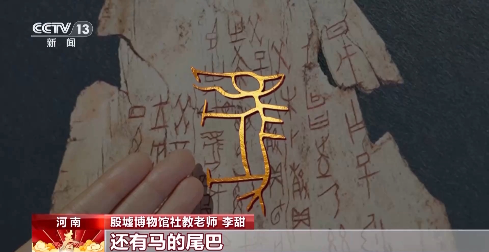 殷墟博物馆讲解员 李甜:这是一个马字,有马头,马的鬃毛、马的蹄子,还有马的尾巴。