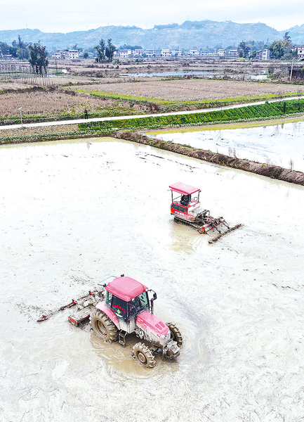 2月24日,重庆市梁平区星桥镇两路村,农机手驾驶拖拉机耕田(无人机照片)。