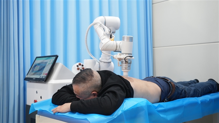 2月26日上午,河南省中西医结合医院的诊室里,66岁的郑州市民李先生像往常一样趴在理疗床上。一只乳白色的机械臂悬停在他肩颈上方,“手指”轻轻落下——点、揉、推、拨,手法娴熟,力道均匀。