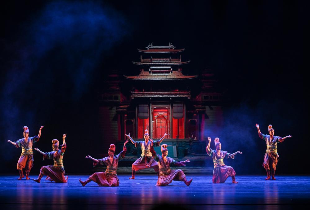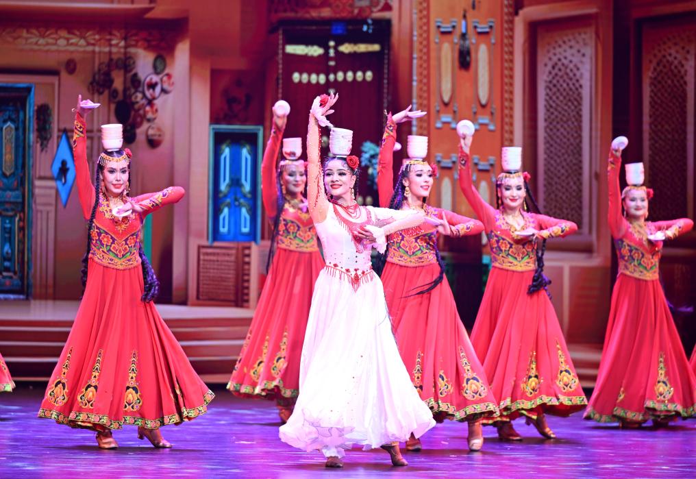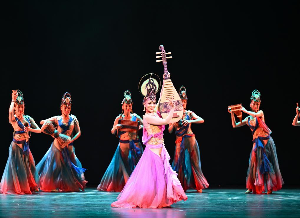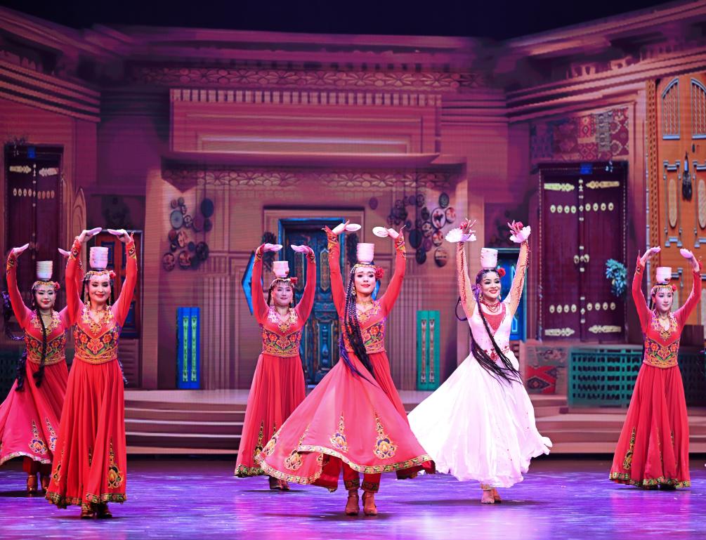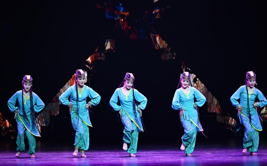 2月28日,演员在大型乐舞诗《杏花之约·丝路龟兹》中表演。新华社记者 李响 摄