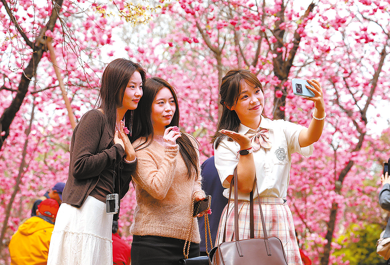 3月7日,游客在云南昆明动物园内拍照打卡。 新华社发(郑益/摄)