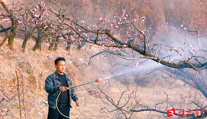 一年之计在于春,果园管护正当时。3月6日,泌阳县马谷田镇朱庄村50余亩杏园,山坡上成排的果树梯次排列整齐有序,含苞待放的花朵迎风摇摆,美景如画。杏园里,30余年的老桩苍劲有力,高高矗立在岩土之上。果农焦勇正带着工人忙着喷洒防虫药剂,为接下来的丰收夯实基础。记者 徐明 摄