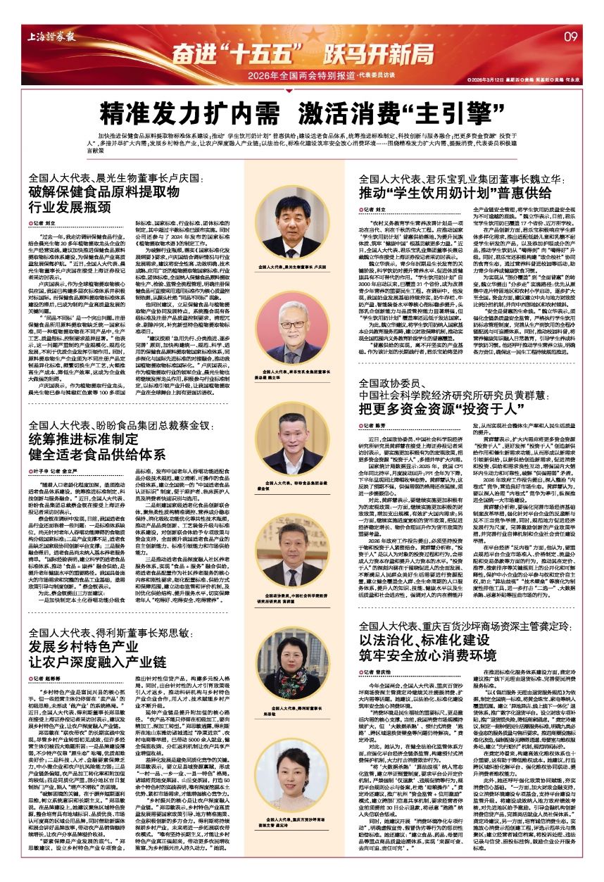 “农村义务教育学生营养改善计划是一项功在当代、利在千秋的伟大工程。应推动国家‘学生饮用奶计划’普惠供给落地,为提升民族体质、筑牢‘健康中国’根基贡献更多力量。”近日,全国人大代表、君乐宝乳业集团董事长兼总裁魏立华在接受上海证券报记者采访时表示。