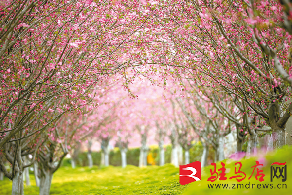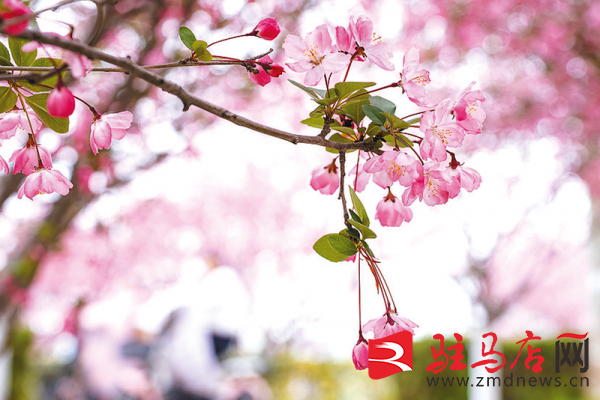 近日,西平县百万株海棠次第开花。在小洪河两岸,花海长廊如云似霞,粉白相间的花瓣随风轻舞,吸引游客纷纷走上河堤、涌入花海,赴一场春日的浪漫之约。