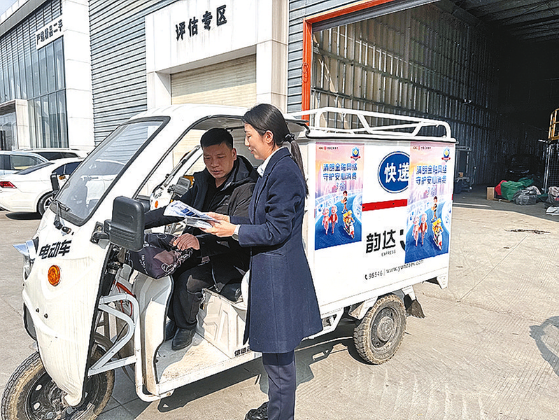 该行聚焦快递员、外卖骑手等新就业群体,组织工作人员走进某快递分拨中心开展面对面宣传。同时,通过发放宣传资料等形式,重点揭示套路贷、虚假保险理赔等金融陷阱。活动现场,该行工作人员准备了“消保暖心包”,并将金融安全提示海报张贴于快递车辆,让消保知识随车而动,延伸宣传触角。50多名快递小哥踊跃参与,点赞该行工作人员细致入微的服务。