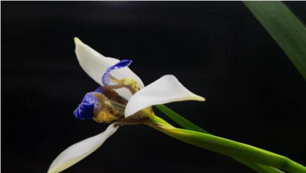 没过几天,那拳头就绽开了。三瓣外轮花瓣悠然垂落,如同蝴蝶垂落的翅膀,瓣上的纹路是细细的蓝,像谁用毛笔勾了边;内轮花瓣更矜持些,微微向上拢着,中心的花蕊藏在里面,像含着的秘密。阳光落在花瓣上,那蓝便活了过来,不是扎眼的艳,像是浸了水的蓝布,润润的,带着点旧时光的温柔。