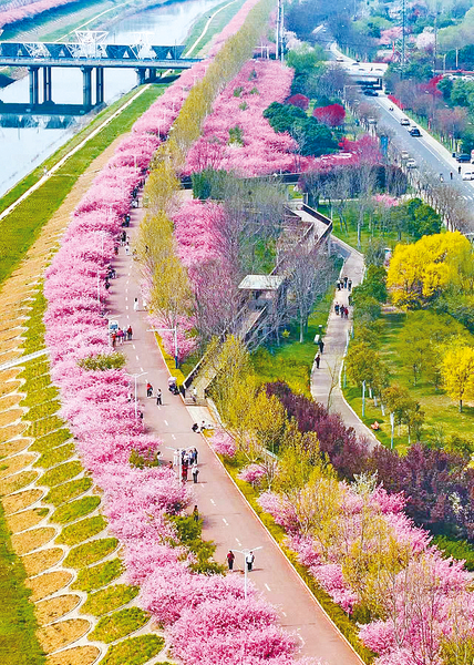 3月29日,西平县小洪河与嫘祖河两岸海棠花进入盛花期。绵延的花海如云似霞,吸引大批市民前来踏青赏春。花树下,有人铺开餐垫露营休憩、有人身着盛装拍照打卡,在烂漫春光中享受惬意的时光。