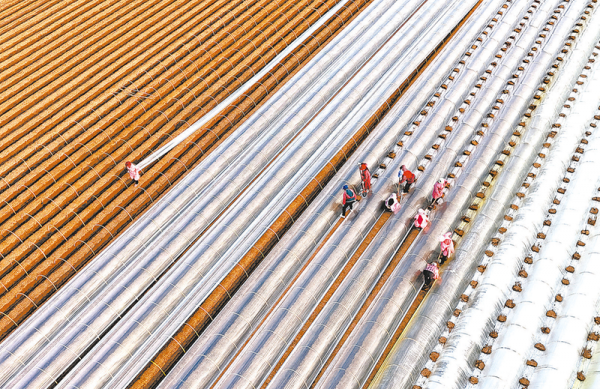 4月5日,河北省石家庄市栾城区西营乡南贾村农民在搭建鲜姜拱棚(无人机照片)。