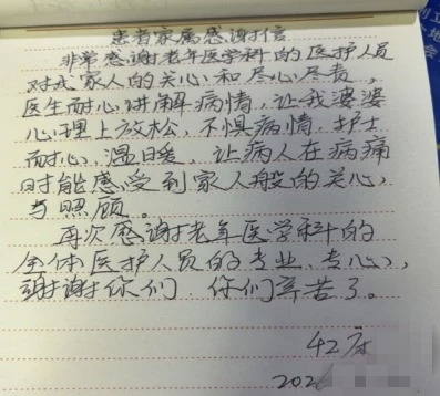 一张信笺,承载的是患者及家属的满满信任;一句感谢,映照的是全体医护人员的医者初心。老年医学科作为该院重点建设科室之一,始终坚守“以患者为中心”的核心服务理念,深度聚焦老年患者的生理与心理双重健康需求,这样的温情故事,每时每刻都在上演。