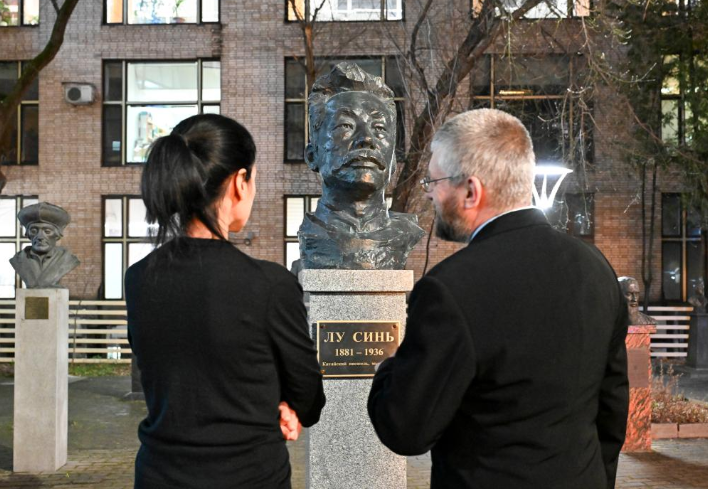 2025年12月5日,在俄罗斯首都莫斯科全俄外国文学国家图书馆,人们驻足观看鲁迅铜像。新华社记者 郝建伟 摄