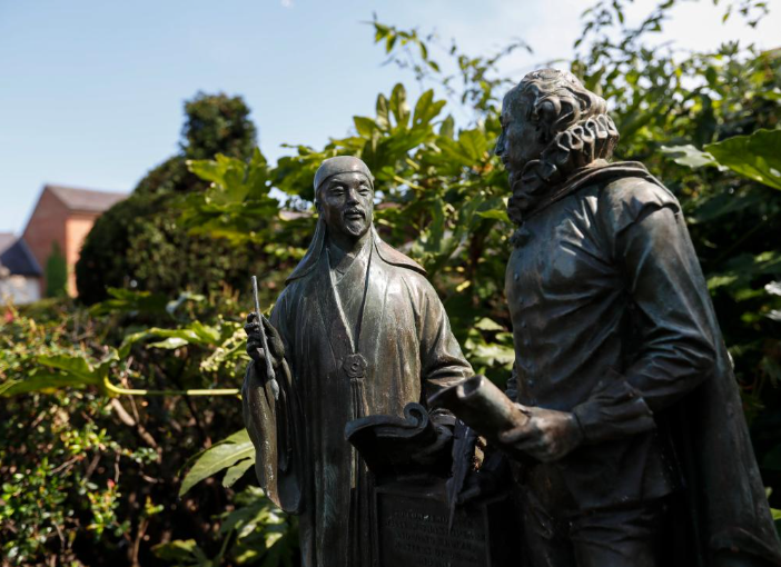 2022年4月20日在英国斯特拉特福拍摄的莎士比亚和汤显祖的青铜塑像。新华社记者 韩岩 摄