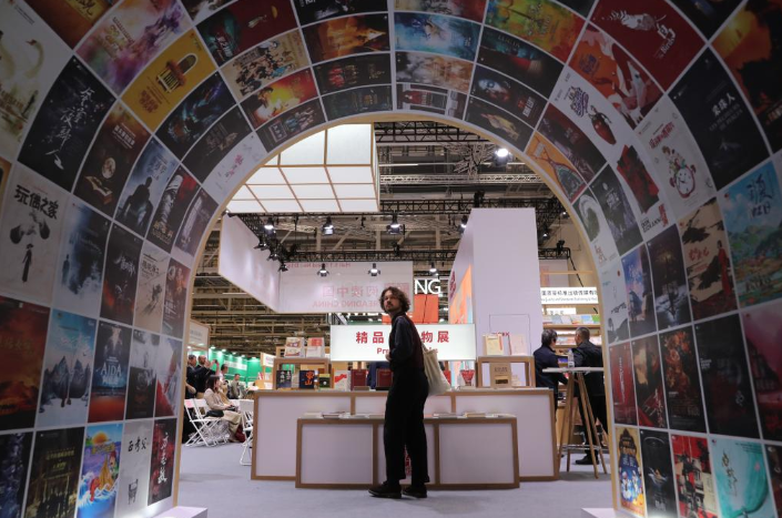 2025年10月15日,一名读者在德国法兰克福书展中国联合展台参观。新华社记者 杜哲宇 摄