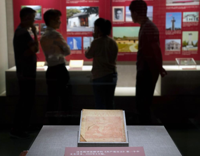 2023年7月25日,在中共一大纪念馆内展出的陈望道译《共产党宣言》首个中文全译本。新华社记者 刘颖 摄